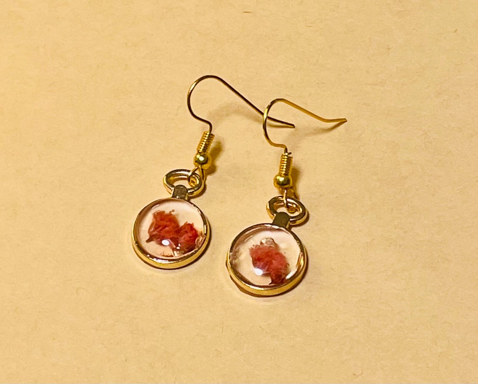 ピンクの花をレジンに閉じ込めた 小ぶりチャームが耳元で揺れる華やかなピアスです お出かけしやすくなるこの季節 華やかな装いのお供にいかがでしょうか♪