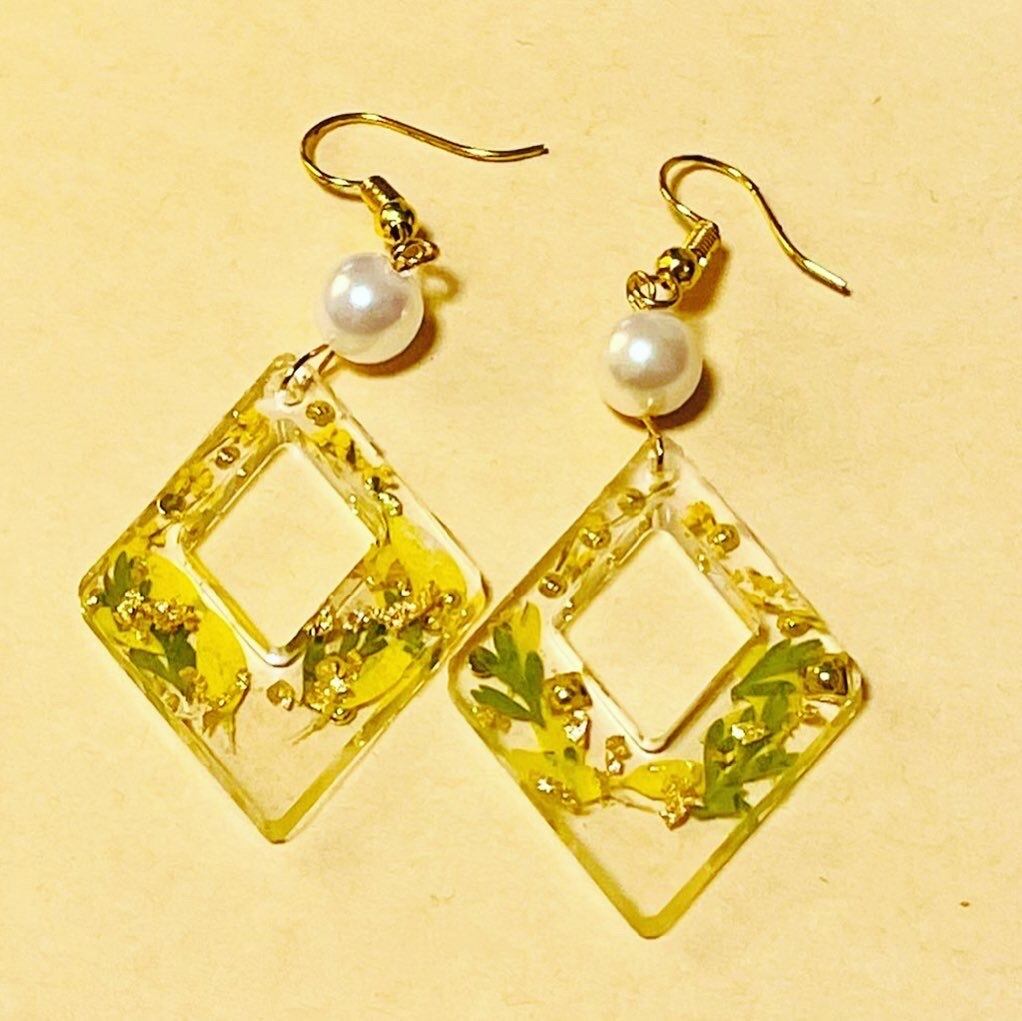 黄色の花々を閉じ込めたレジンの ハンドメイドピアスです。 華やかなピアスをお出かけのお供に いかがでしょうか♪